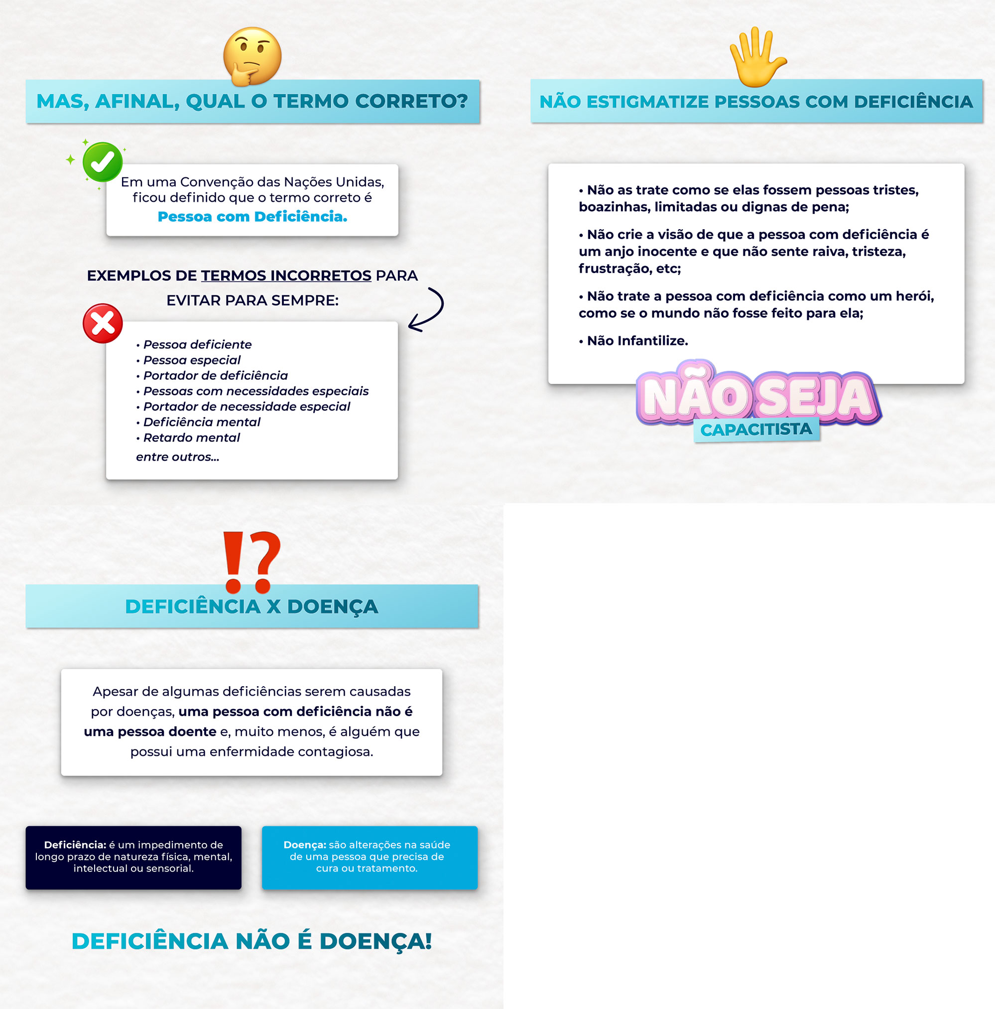 Esses dois termos podem estar relacionados, mas não são sinônimos. Pessoas com deficiência podem ter iguais condições de saúde a pessoas sem deficiência e sua condição não deve ser “corrigida”.