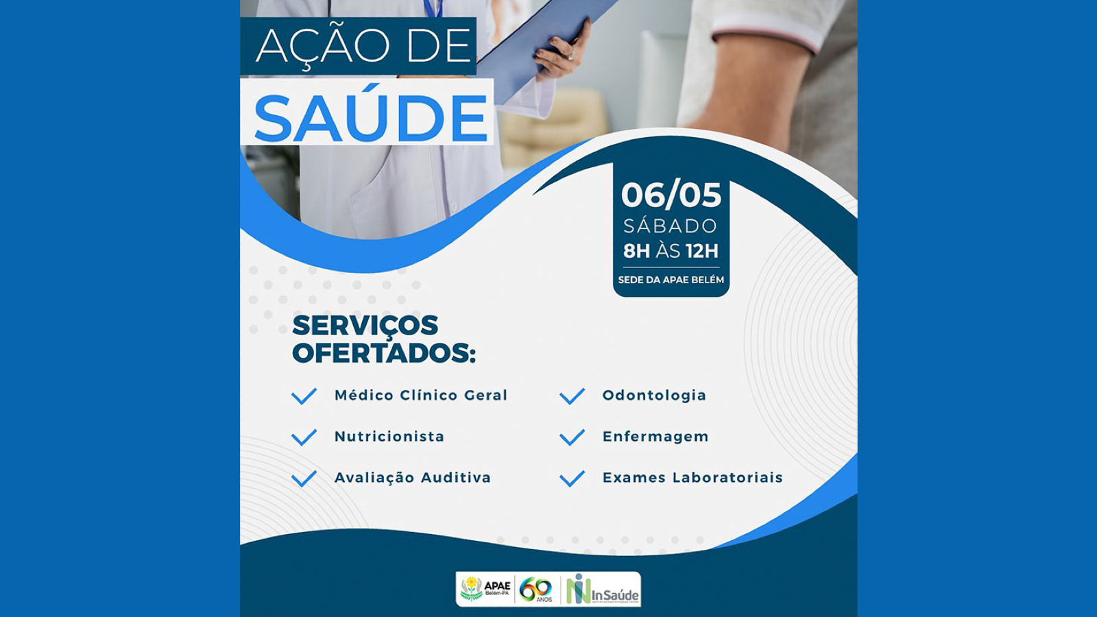 A APAE Belém, em parceria com o Instituto Nacional de Pesquisa e Gestão - InSaúde - promovem, no próximo sábado (6), no período de 8h às 12h, ação de saúde na sede da instituição.