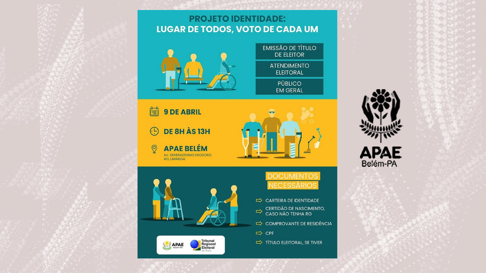 A APAE Belém, em parceria com o Tribunal Regional Eleitoral (TRE) do Pará, vai realizar uma ação especial com serviços eleitorais abertos ao público em geral. 🗳️